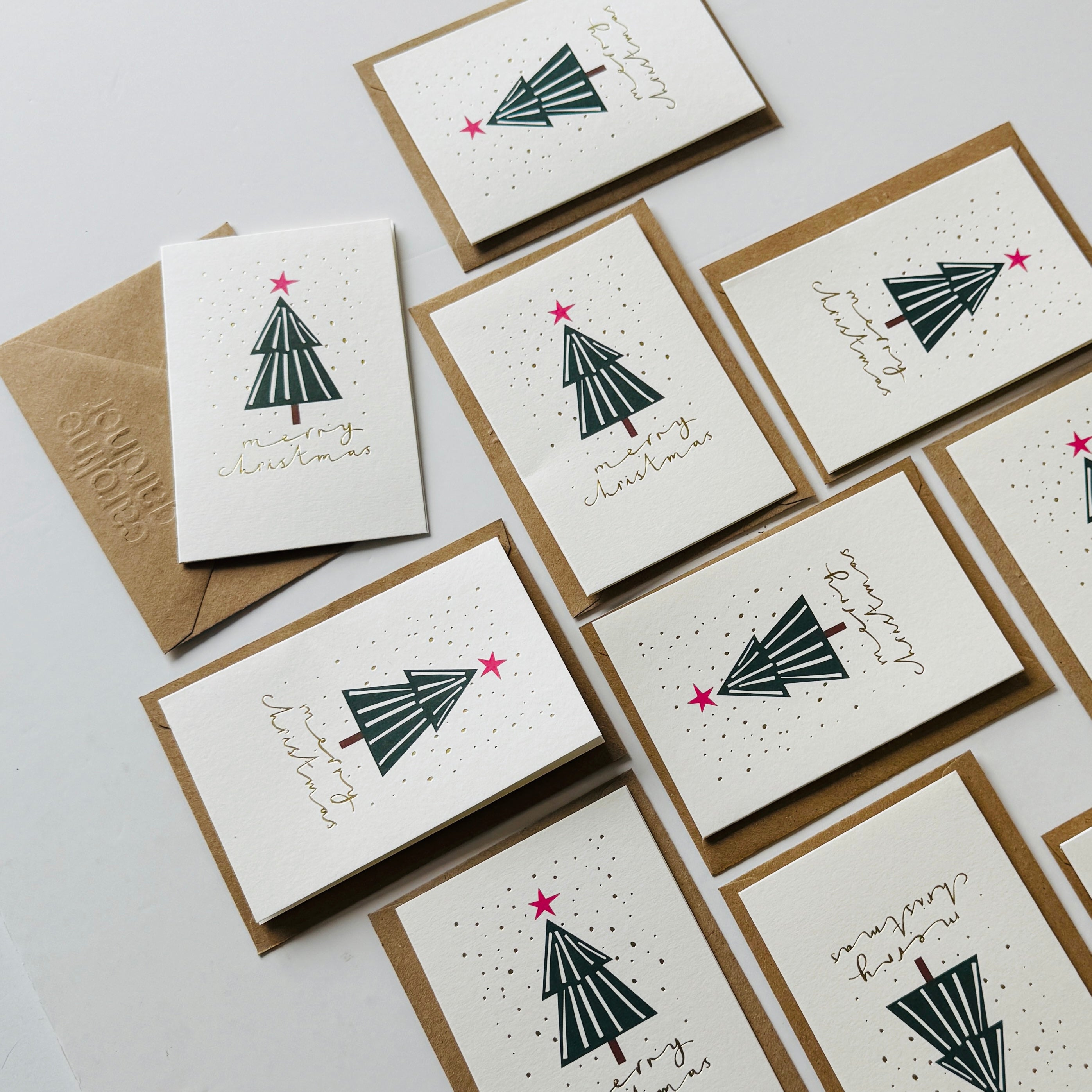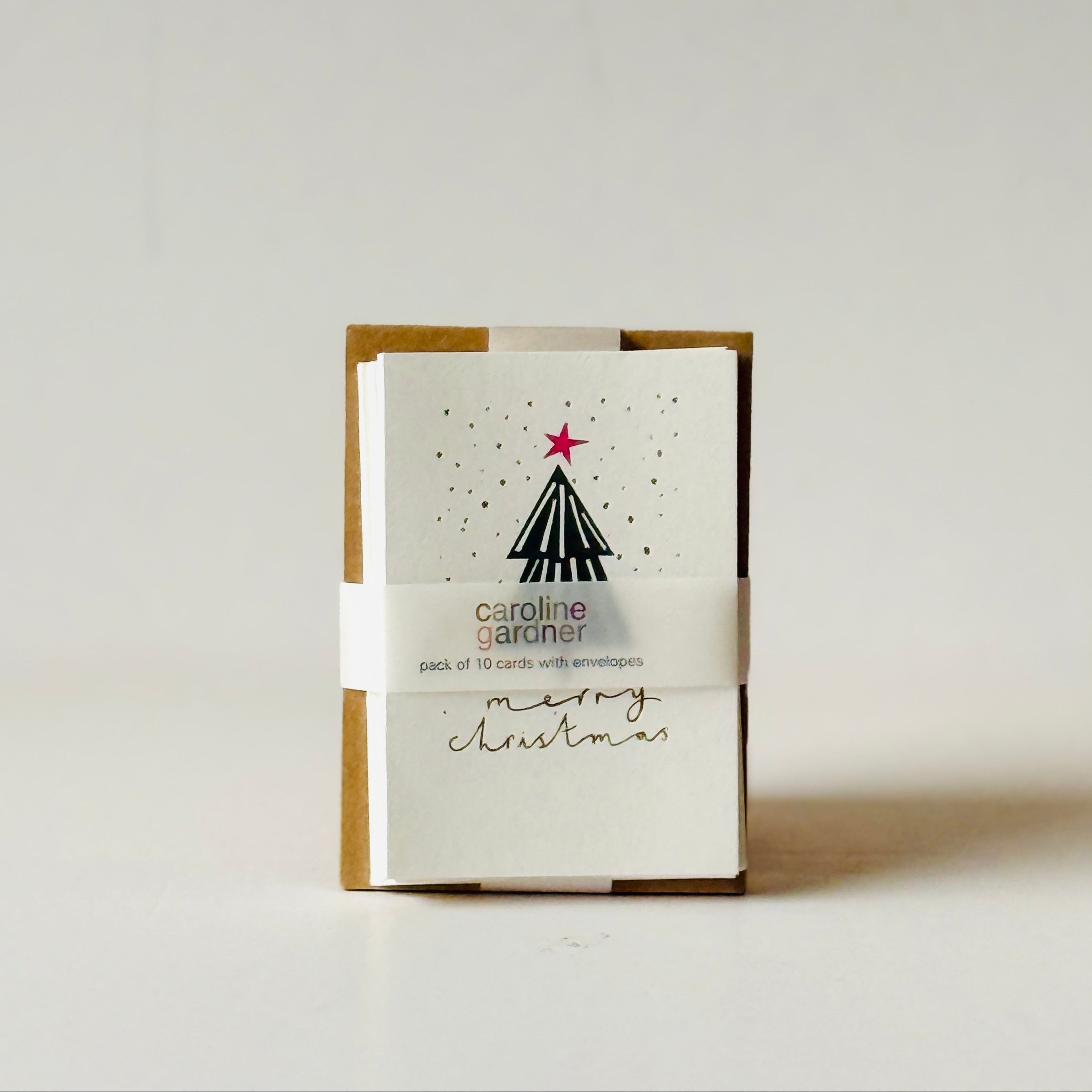 Celebrate the festive season with these geometric tree Christmas Cards by Caroline Gardner. This set includes 10 charming mini cards with gold foil and kraft envelopes. Perfect for spreading holiday cheer in a personal and stylish way.