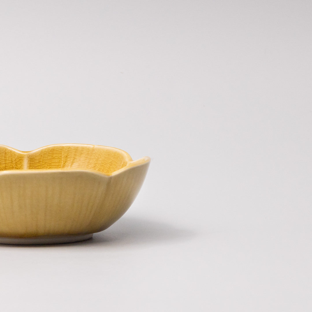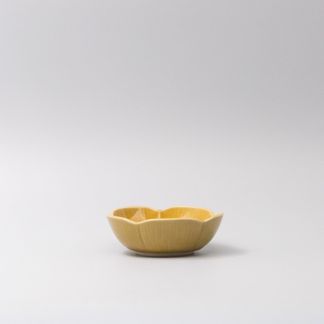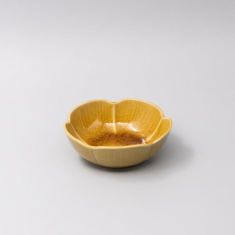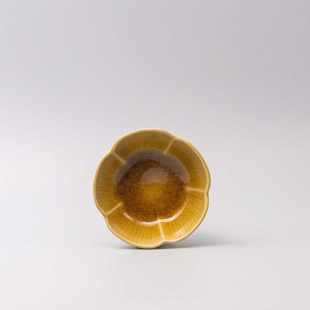 Featuring a delicate flower shaped sauce dish in a beautiful amber glaze. Made of 'Minoyaki' porcelain, fired at a high temperature and hand finished.