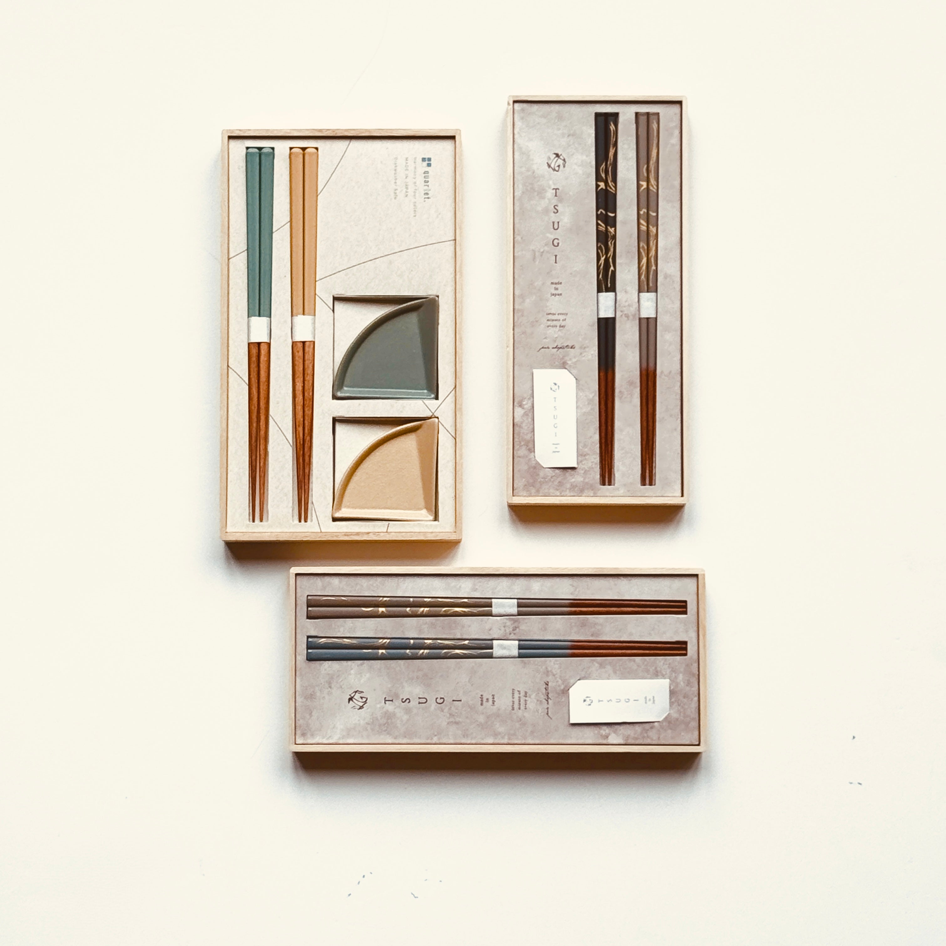 Presented in a paulownia wood box with a foil-stamped logo, this gift set features two pairs of "TSUGI" natural wood chopsticks inspired by the Japanese kintsugi technique, which mends ceramics with gold to highlight their flaws. Their sleek, refined shape and radiant gold seam elegantly enhance the feel in your hands. Crafted from natural wood, the chopsticks include non-slip tips and are dishwasher safe for practical use.