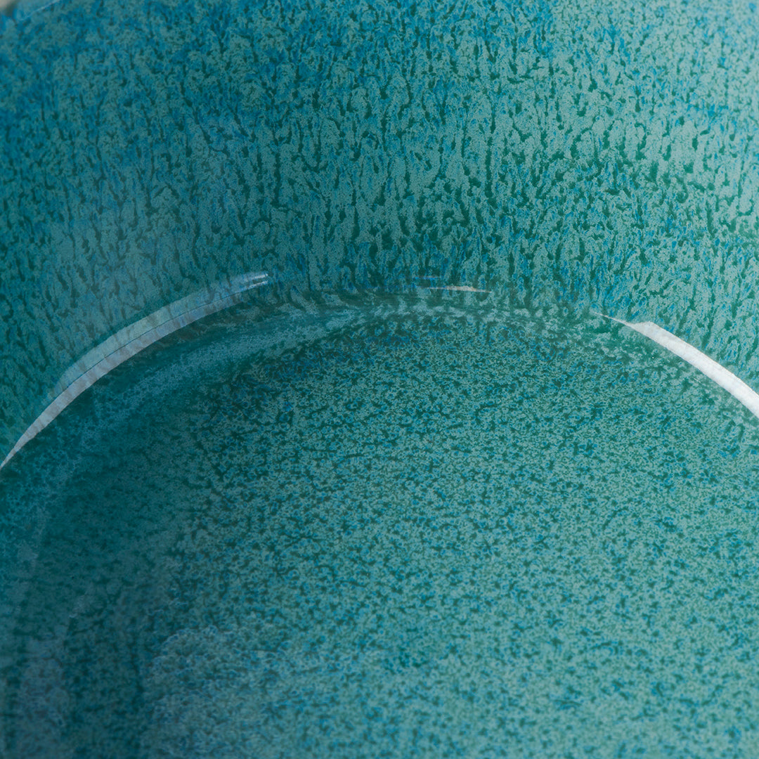 The Peacock glaze features a bold teal blended with a rich, iridescent blue. Each piece has a unique finely dappled pattern determined by its position in the kiln during the firing process. Focusing on simple, practical shapes and with a gloss finish, the Peacock range provides a bold background to your creations in the kitchen.