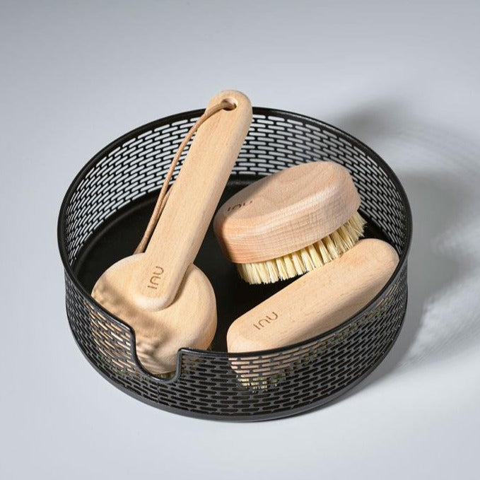 Zone Denmark’s spa range has been created for those little moments of pleasure and presence in our busy routines. Made of light beech and natural hair, their soft, organic design harmonises beautifully with the simple decor and soft shades of the bathroom. Soft, simple and stylish.
