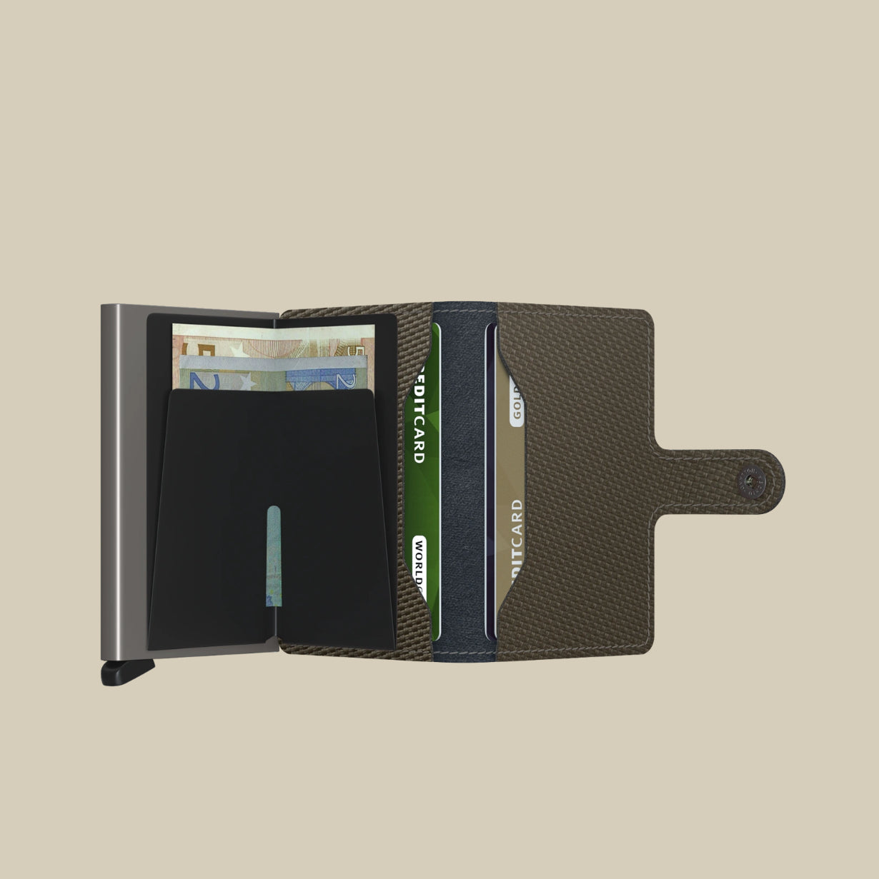 Small in size and surprisingly large in storage capacity, the Mini wallet combines the best of both worlds. The exterior holds banknotes, receipt and cards, while the aluminium Card protector allows you to slide out cards with one simple motion and protects them from bending, breaking and unwanted wireless communication.