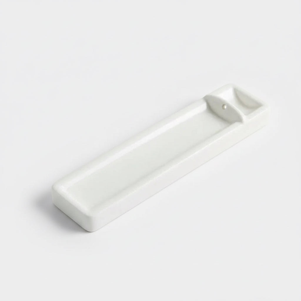 This ceramic incense holder is designed for long incense sticks, offering a calm and refined way to enjoy fragrance. Finished in a milky white tone inspired by traditional Japanese ceramics, it rests quietly in any space and complements both modern and classic interiors. The slender form allows the incense to burn cleanly, while the hole at one end holds it securely and extinguishes the flame once it reaches the base. A serene companion for moments of focus, rest or quiet reflection.