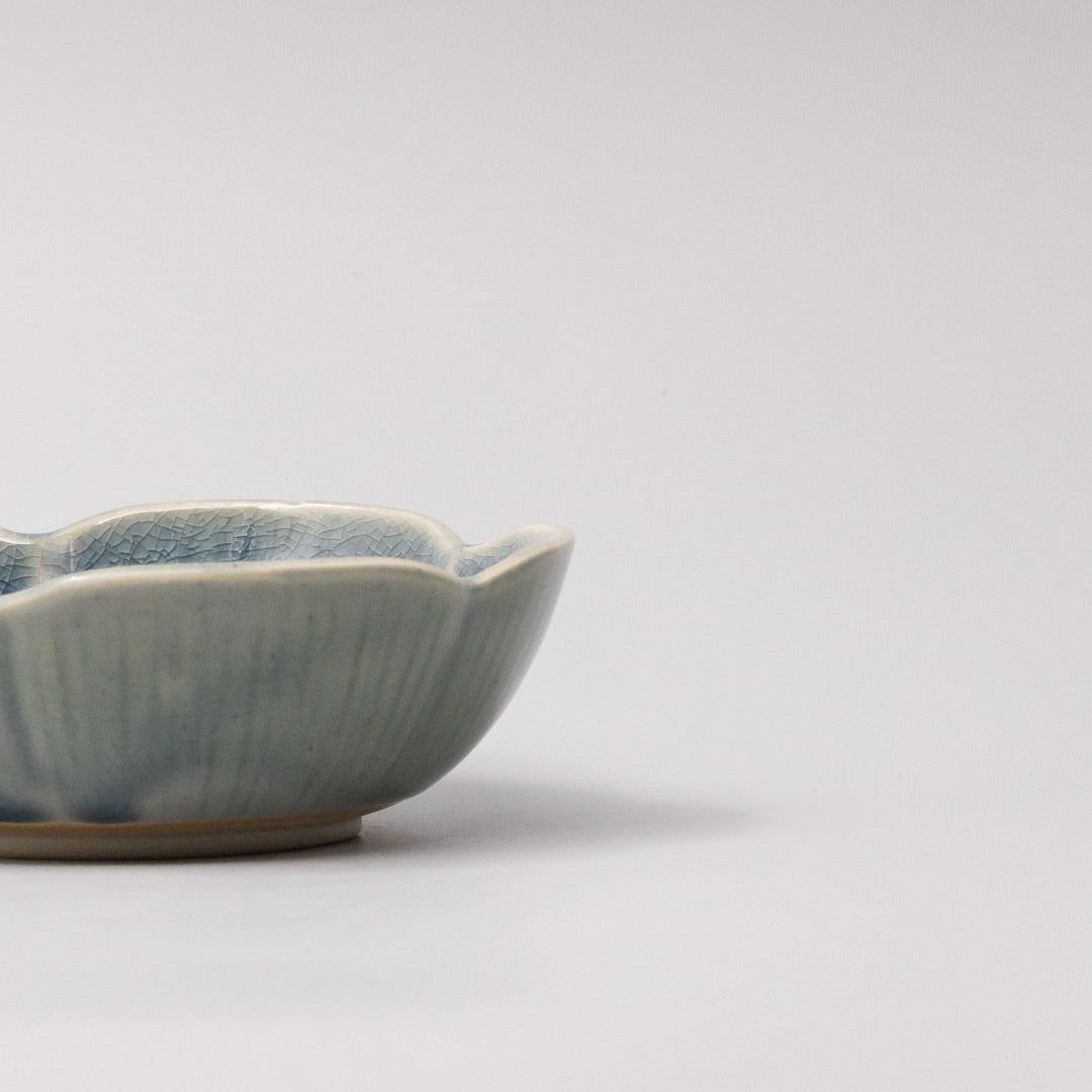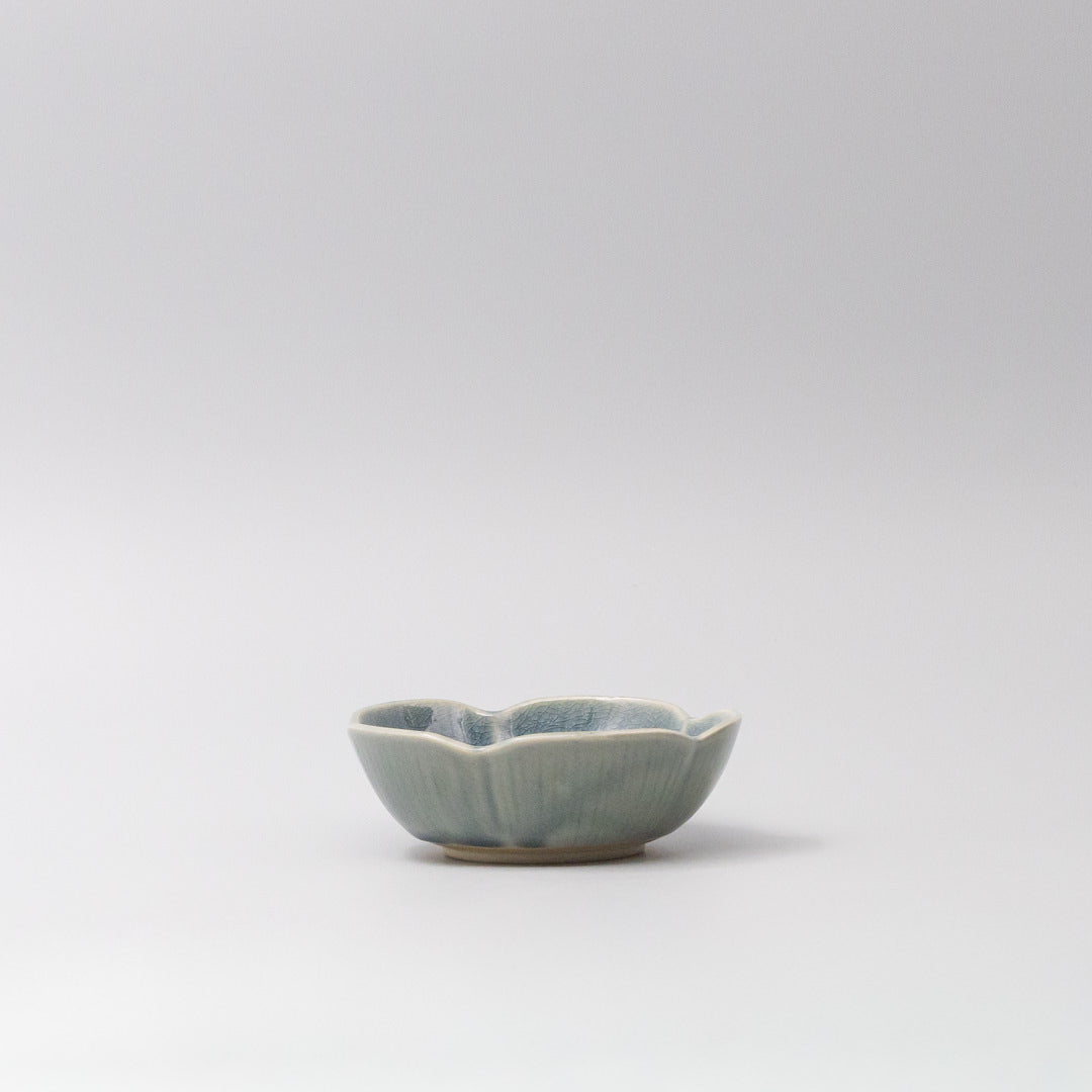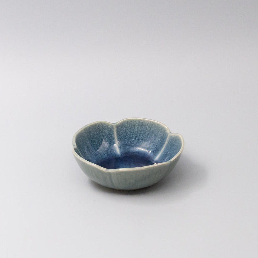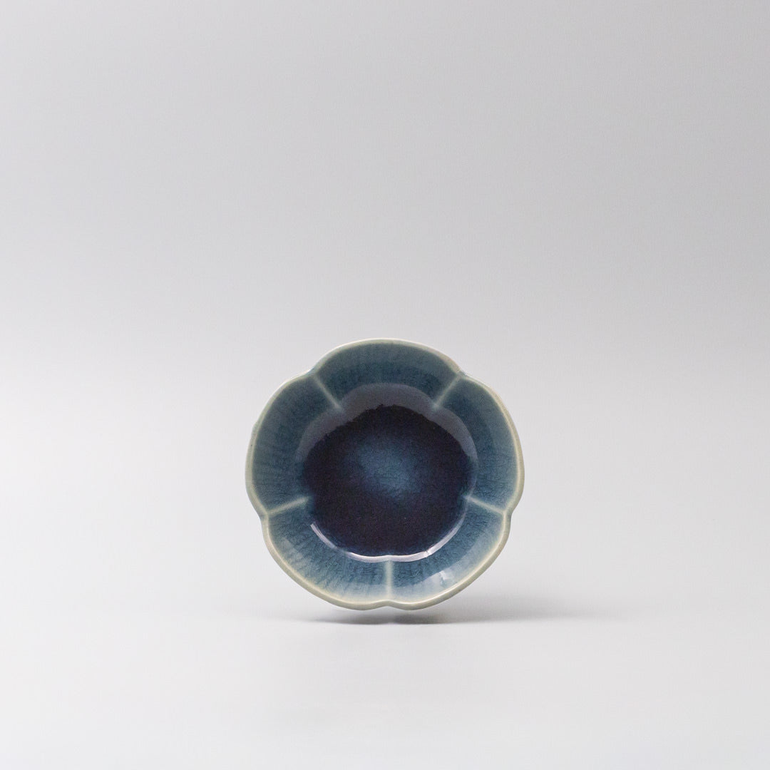 Featuring a delicate flower shaped sauce dish in a beautiful sapphire glaze. Made of 'Minoyaki' porcelain, fired at a high temperature and hand finished.