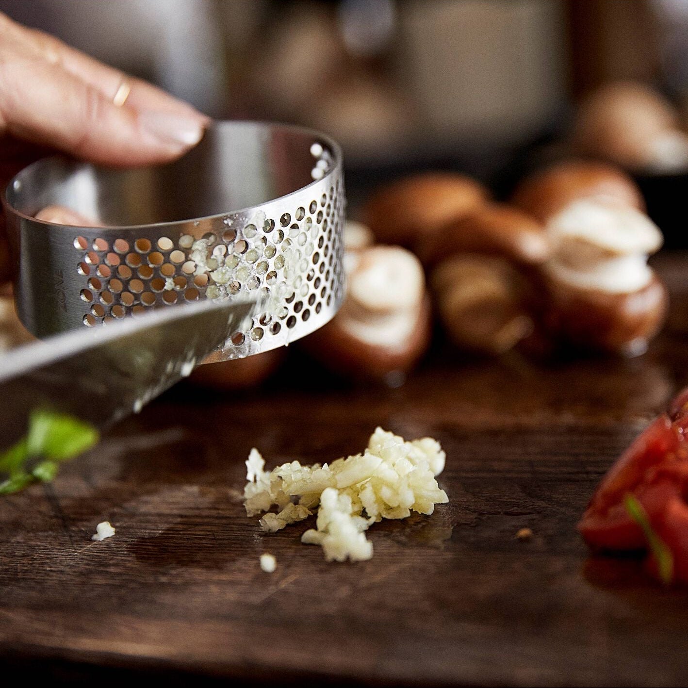 Seductively simple — two words are all that are needed to describe the garlic press from Zone Denmark. Form and function achieve synthesis in a beautiful and effective tool that is completely without mechanical parts. All you have to do is roll it across the garlic clove and scrape the pressed garlic off the inner side of the ring. The holes can then be cleaned easily and quickly using a brush under running water.
