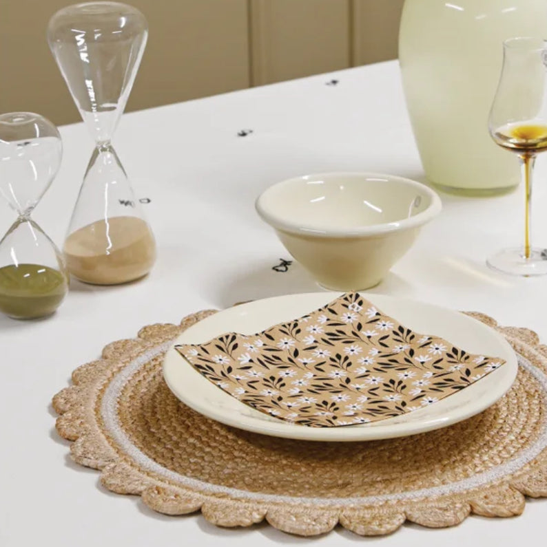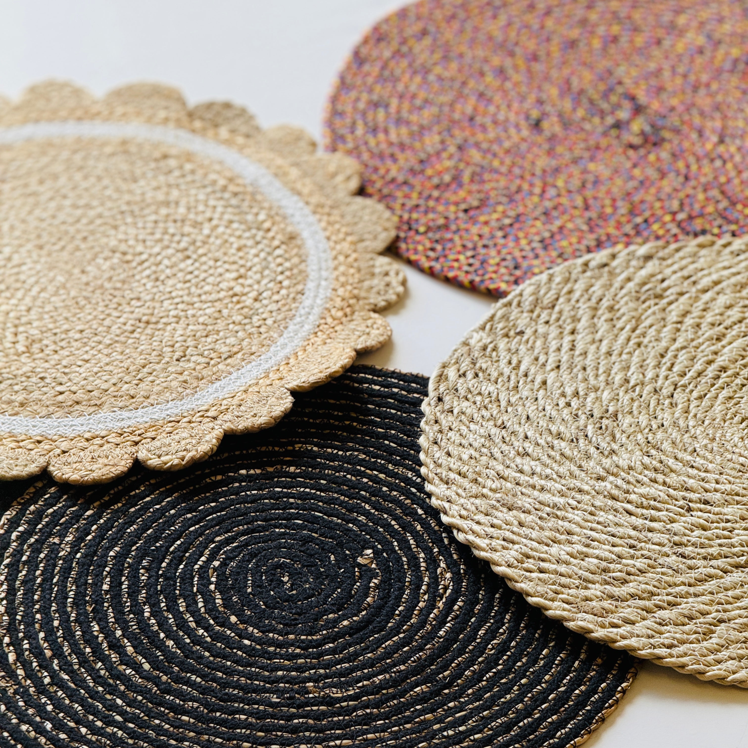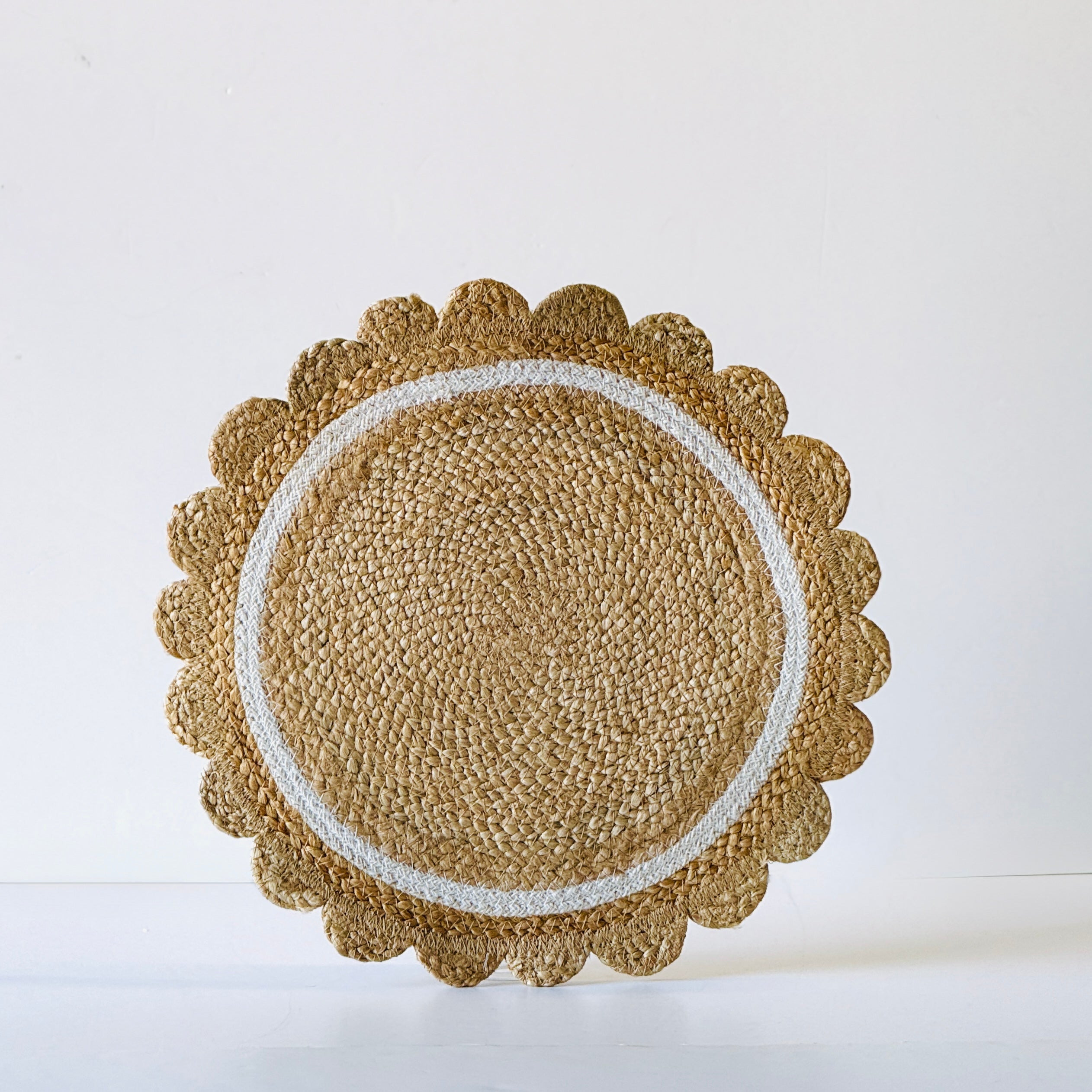Our scalloped natural with white jute placemat is a stylish way to bring a classic, natural-fiber chic look to your dining area. Its round jute design adds a modern touch to any table setting. Perfect for everyday use or special occasions.